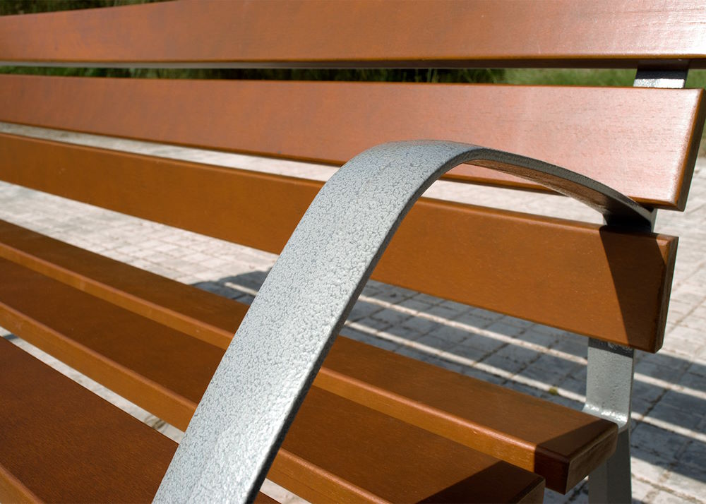 El NEOBARCINO es un banco fabricado con pies de fundición dúctil tratado con Ferrus, un proceso protector del hierro, que garantiza una óptima resistencia a la corrosión. El tratamiento Ferrus se compone de tres capas que se aplican después de limpiar toda la suciedad y las impurezas mediante granallado y consiste en un baño electrolítico, seguido de una capa de imprimación epoxi y un último recubrimiento de pintura poliéster en polvo color gris martelé.