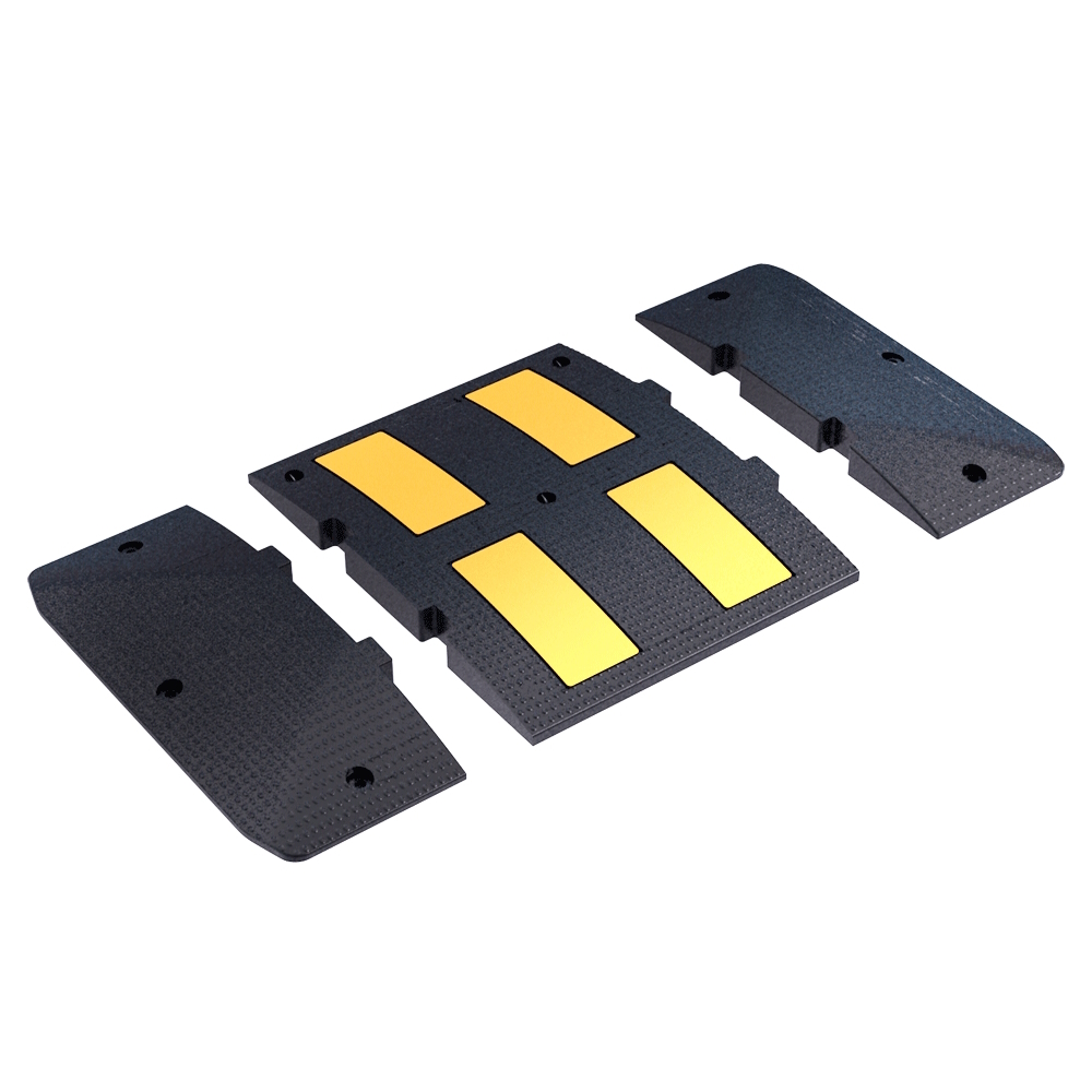 Fabricado en material 100% reciclable y ecológico. Conjunto de módulos independientes que forman una banda reductora de velocidad. Realizados en goma natural visible mediante franjas amarillas y negras paralelas a la dirección de la marcha, de elevada retroreflectancia y antideslizantes.Se adapta perfectamente al pavimento, absorbe deformaciones, no se degrada ni se agrieta y no produce contaminación acústica.