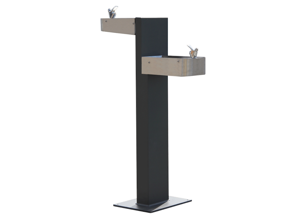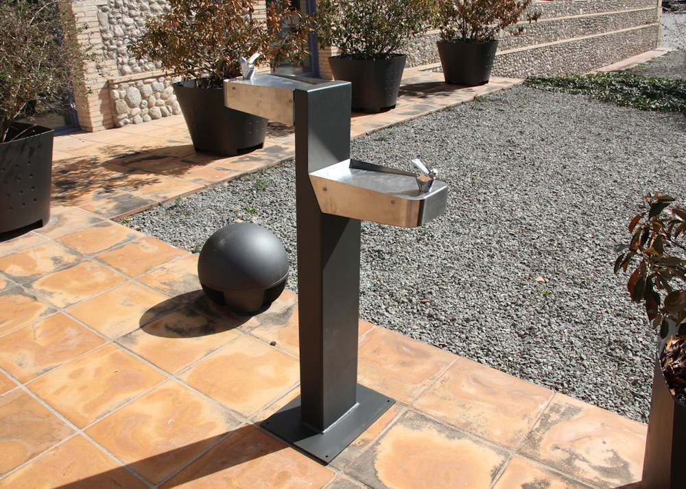 Fuente fabricada de acero con tratamiento Ferrus, proceso protector del hierro que garantiza una óptima resistencia a la corrosión. El tratamiento Ferrus se compone de tres capas que se aplican después de limpiar toda la suciedad y las impurezas mediante granallado y consiste en un baño electrolítico, seguido de una capa de imprimación epoxi y un último recubrimiento de pintura poliéster color gris martelé.