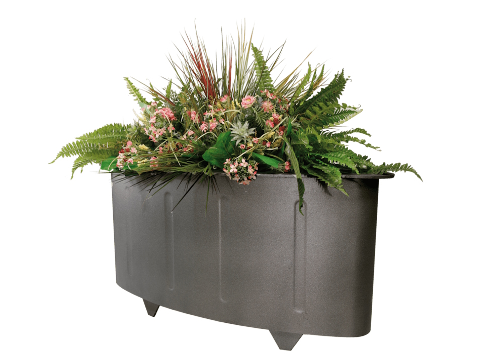 Jardinera Oval de acero 1000 x 400 x 525 O. Negro Fabricada en acero con tratamiento Ferrus, proceso protector del hierro, que garantiza una óptima resistencia a la corrosión. Acabado zincado electrolítico con imprimación epoxi y pintura poliéster en polvo color negro forja. Jardinera apoyada sobre cuatro soportes triangulares.