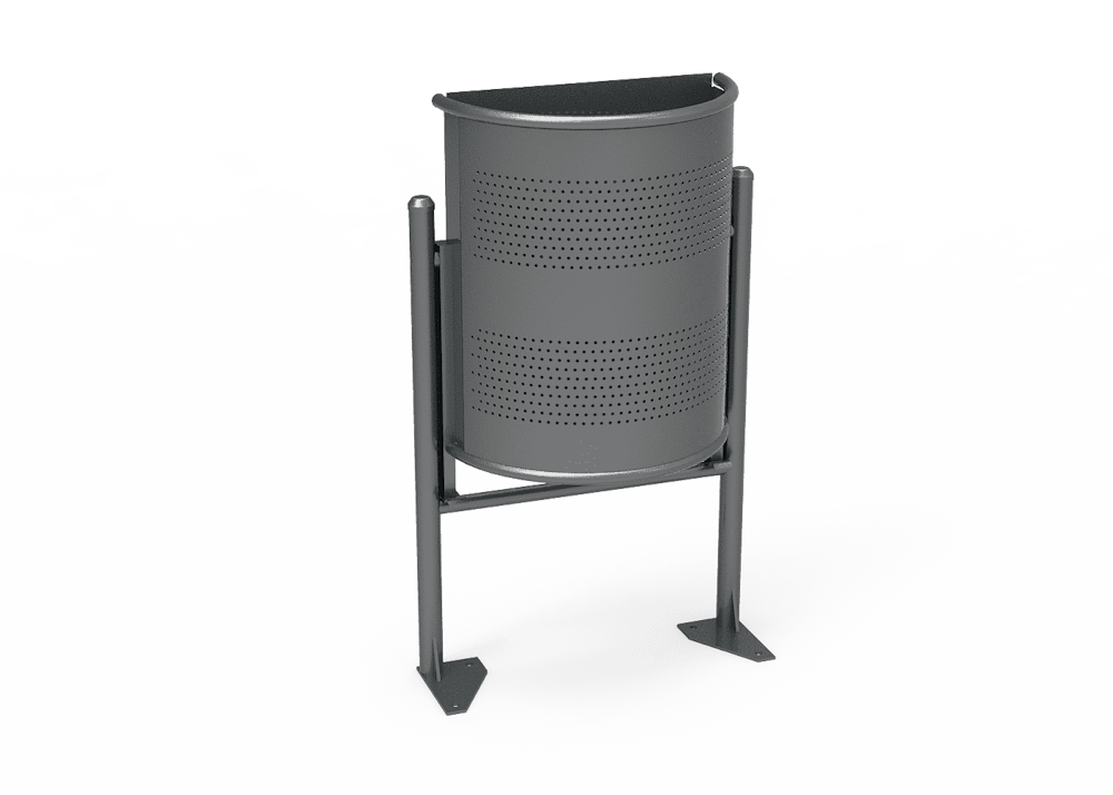 Papelera Semicircular 40 litros PA616M. Fabricada con cubeta semi-circular abatible de acero con agujeros triangulares con tratamiento Ferrus, proceso protector del hierro, que garantiza una óptima resistencia a la corrosión.