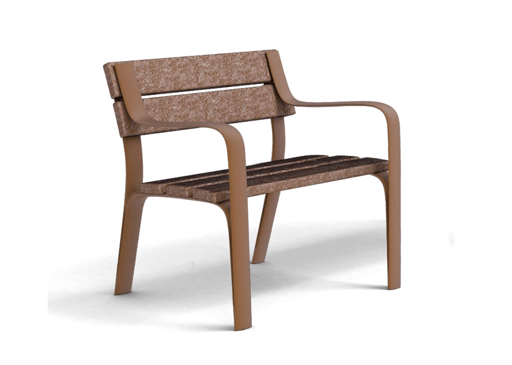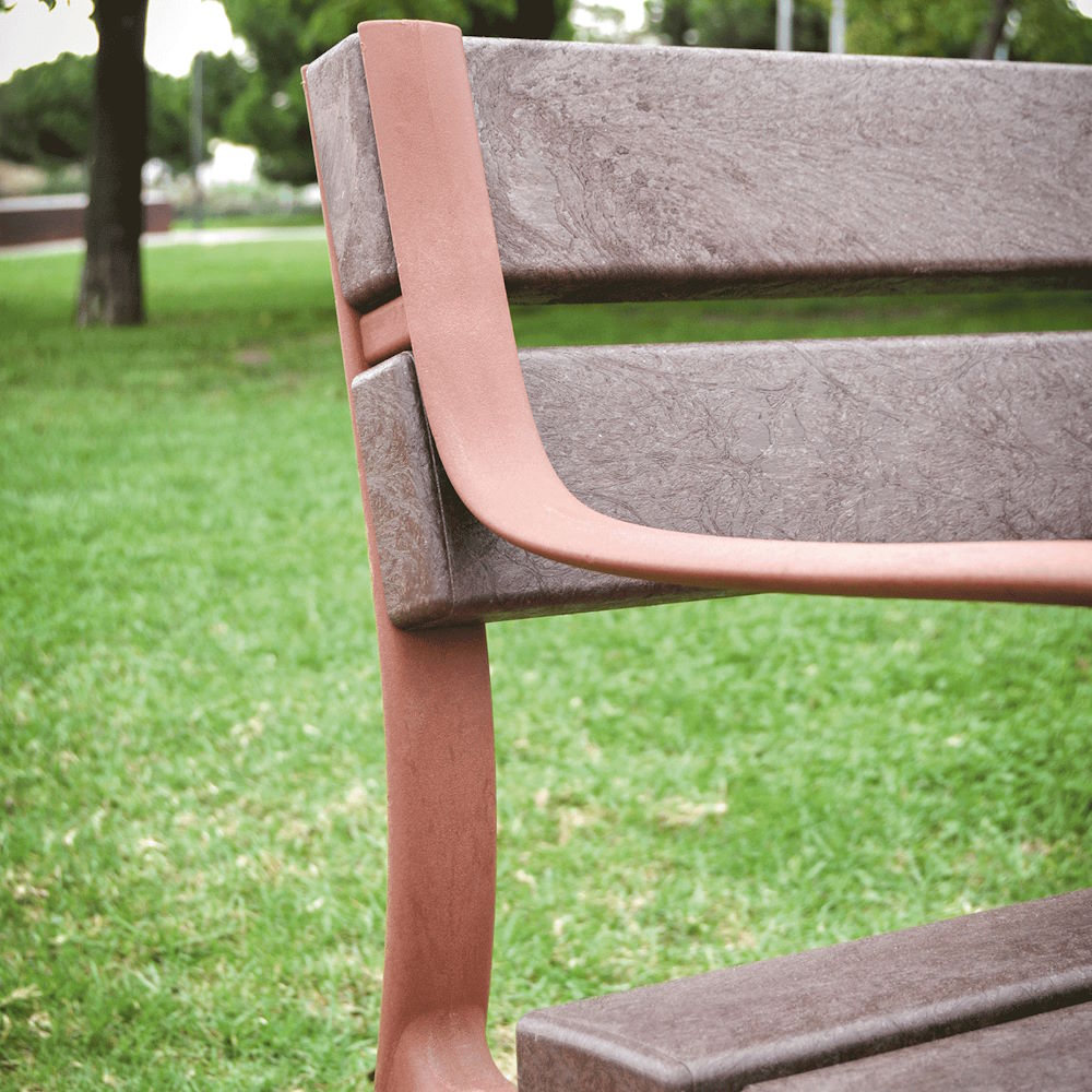 Asiento y respaldo en tablón ReBnew reforzado con perfil metálico en el caso del asiento, bancada con apoyabrazos fabricada en polímero inyectado a alta presión, con acabado marson. No requiere mantenimiento, no se astilla ni se agrieta, tampoco se pudre ni se reseca. Resistente a la humedad. Alta resistencia a las inclemencias. Resistente a todo tipo de agentes químicos hasta el punto de poder limpiar pintadas y grafitis.